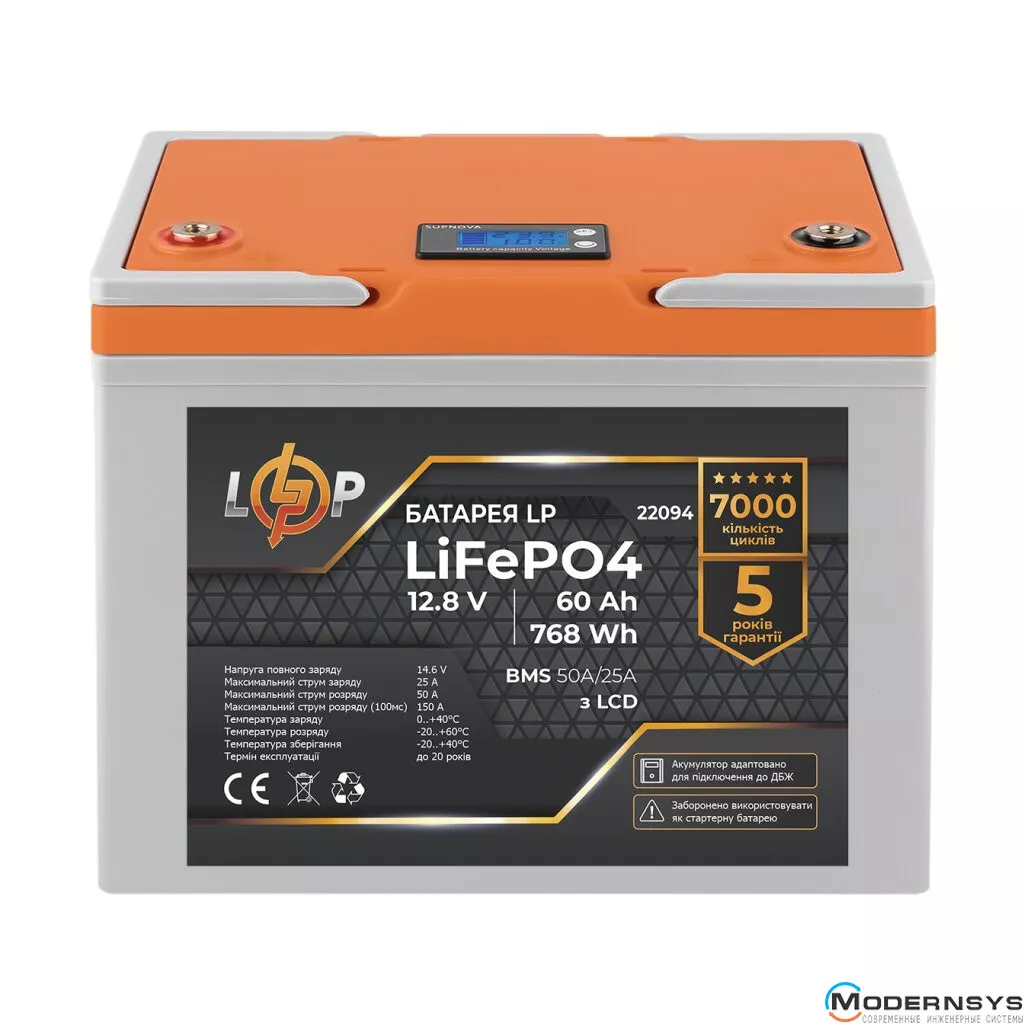 Аккумулятор LogicPower LiFePO4 12,8V - 60 Ah (768Wh) (BMS 50A/25А) пластик LCD для ИБП (LP22094)