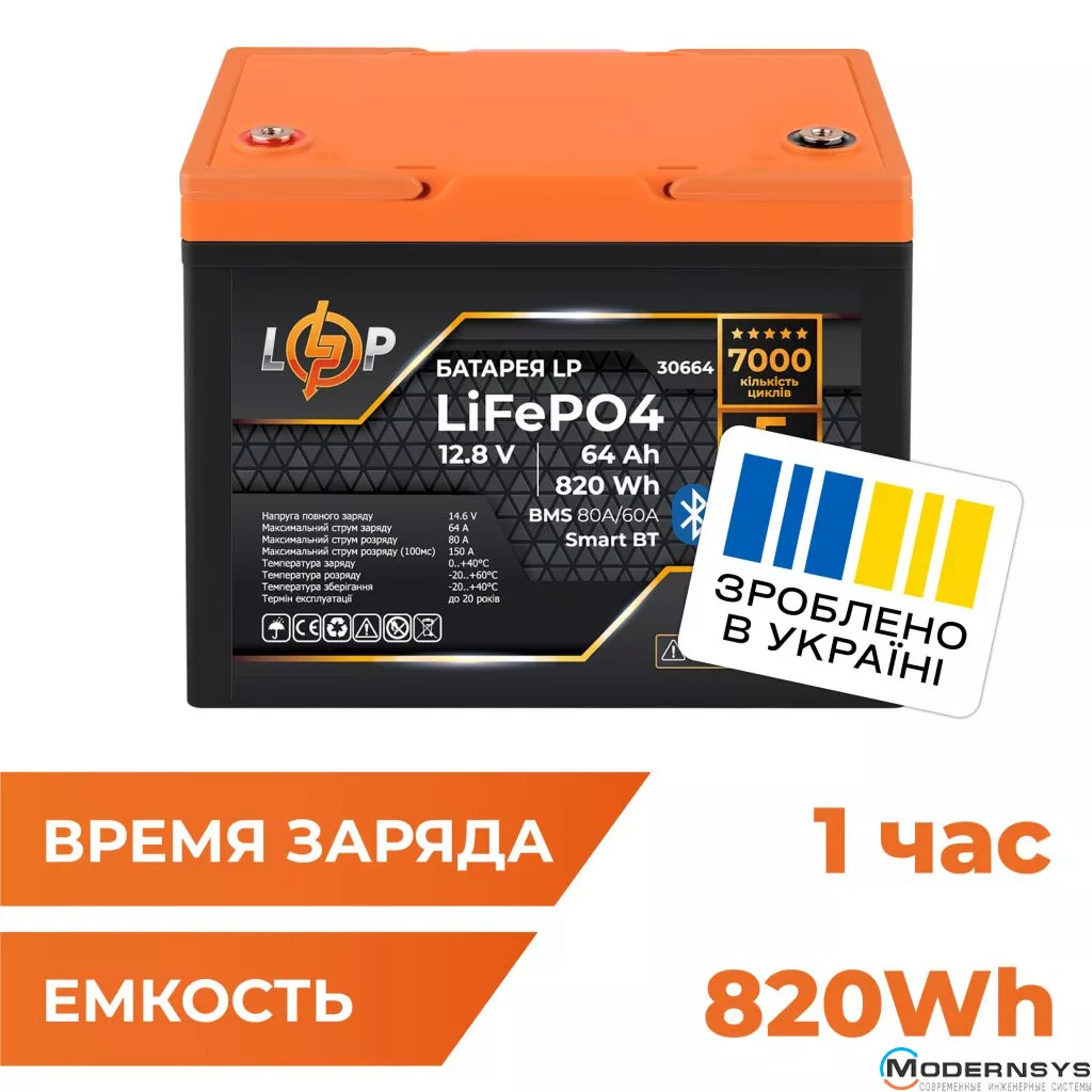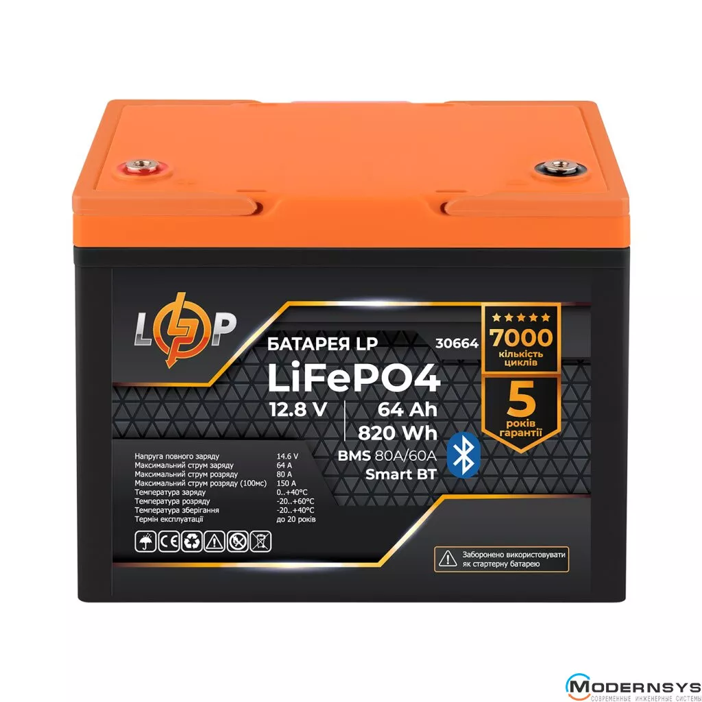 Аккумулятор LogicPower LiFePO4 12,8V - 64Ah (820Wh) (BMS 80A/64А) пластик Smart BT (LP30664)