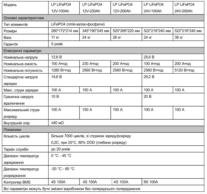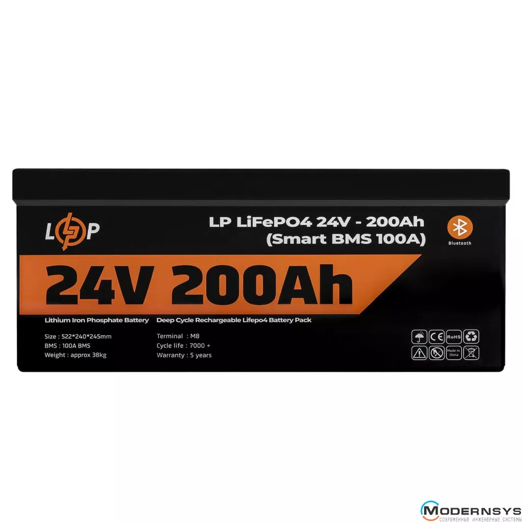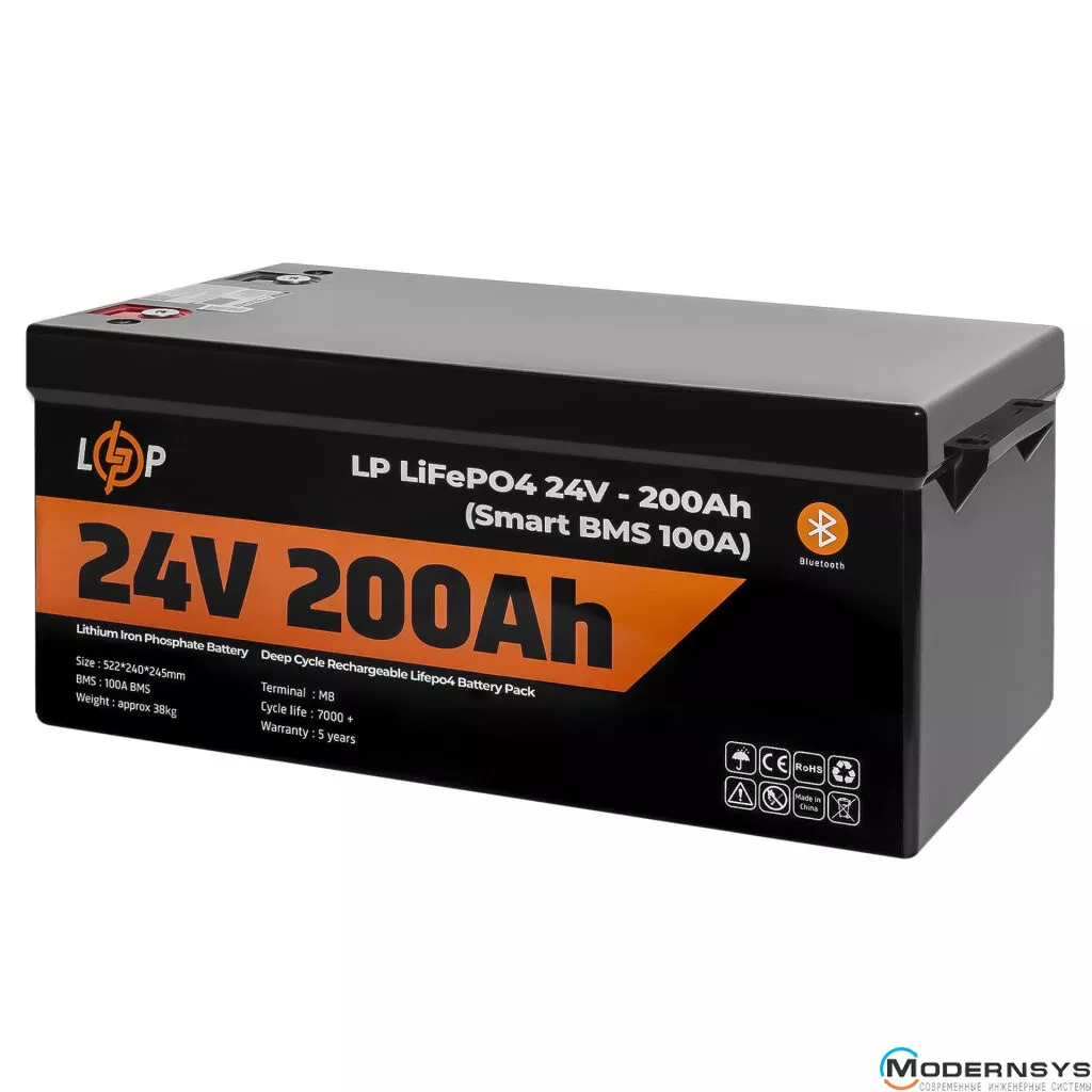 Технические характеристики: Аккумулятор LogicPower (Лоджик Повер) LiFePO4 24V (25,6V) - 200 Ah (5120Wh) (Smart BMS 100А) с BT пластик для ИБП