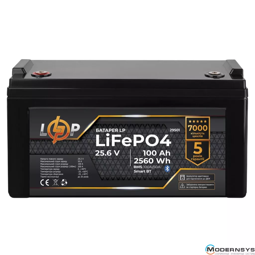 Аккумулятор LP LiFePO4 25,6V - 100 Ah (2560Wh) (BMS 80A/80А) пластик Smart BT