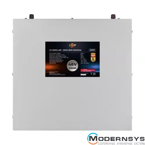 Литий-железо-фосфатный аккумулятор LP LiFePO4 48V - 230 Ah металл. Внешняя установка, обладает высокой плотностью энергии, отсутствием вредных испарений и служит надежным и мощным источником электрической энергии. Отличается большим сроком службы и имеет до 7000 рабочих циклов. Мы рекомендуем их для использования, где важен высокий срок службы, высокая емкость и надежность. Срок службы до 15 лет.