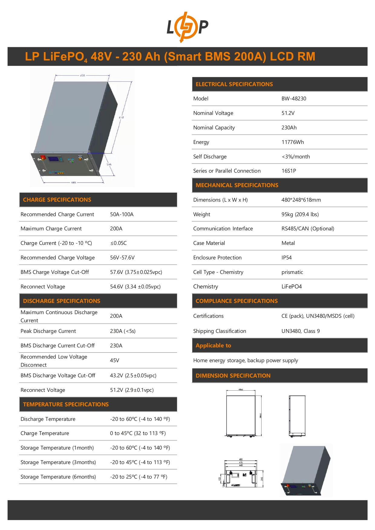 Технические характеристики: Аккумулятор LogicPower (Лоджик Повер) LiFePO4 48V (51,2V) – 230 Ah (11776Wh) (Smart BMS 200A) с LCD RM