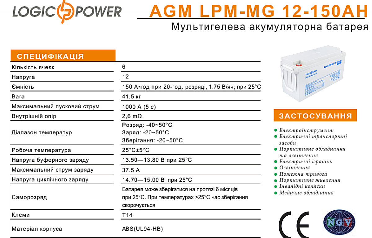 Технические характеристики: Аккумулятор LogicPower (Лоджик Повер) мультигелевый LPM-MG 12V - 150 Ah