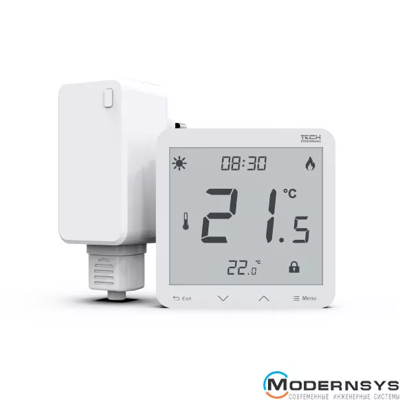 Беспроводной комнатный терморегулятор TECH ST-297z v2, работает от сети – 230 В / 50 Гц или двух батареек ААА 1,5 В, используется для регулировки температуры в отдельной зоне нагрева. Диапазон настройки температуры составляет – 5-35 °С.