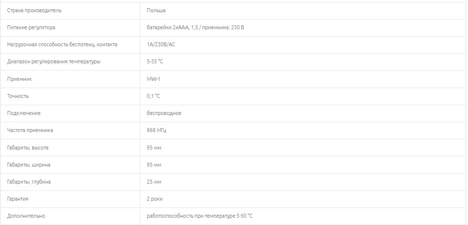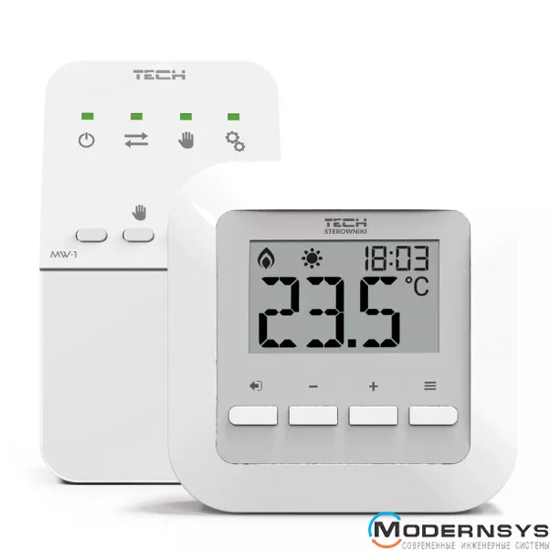 Беспроводной комнатный терморегулятор TECH ST-295 v2, работает от двух батареек типа ААА, которых хватит на 2 года безупречной работы (входят в комплект), имеет приемник, он подключается к обогревательному прибору и подает сигнал регулятору по беспроводной связи на частоте 868 МГц. Используется для управления температурой в помещении, в диапазоне 5-35 °С, посредством работы с газовым, электрическим котлом или смесительным клапаном, включает его если температура в помещении ниже заданной и выключает когда нужна температура достигнута.