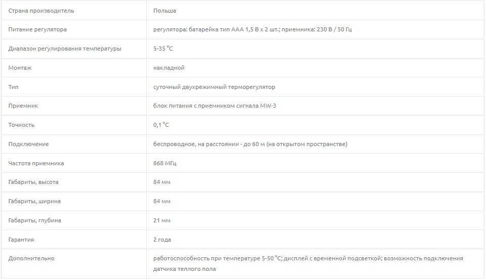 Также возможно подключение датчика пола, для контролирования работы системы “теплый пол”. Беспроводная связь с приемником, позволит установить термостат в удобном для Вас месте. Работает на частоте – 868 МГц, что обеспечивает бесперебойную связь термостата с контроллером, на расстоянии – до 60 м на открытом пространстве, при чем не создавая помехи в работе бытовых приборов, таких как Wi-Fi роутер.