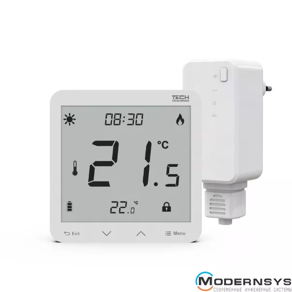Комнатный термостат TECH T-3.2 работает по беспроводной связи с приемником TECH MW-3, который подключается к отопительному прибору через двухжильный кабель NO-COM-NC и на основании данных от терморегулятора, запускают отопление – если температура в помещении опускается ниже заданной, и выключает – когда нужная температура достигнута. Также доступны настройки температуры по отдельности для дня и ночи.
