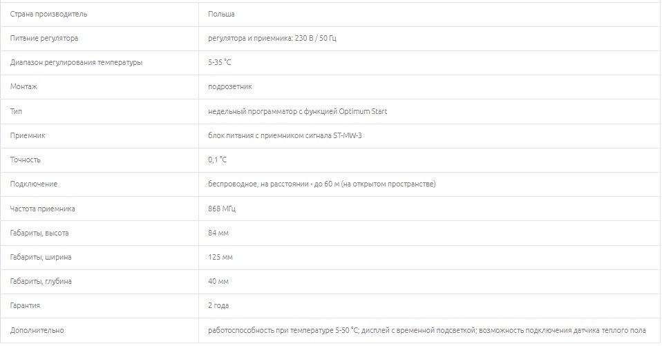 - встроенный температурный датчик и возможность подключения датчика теплого пола;