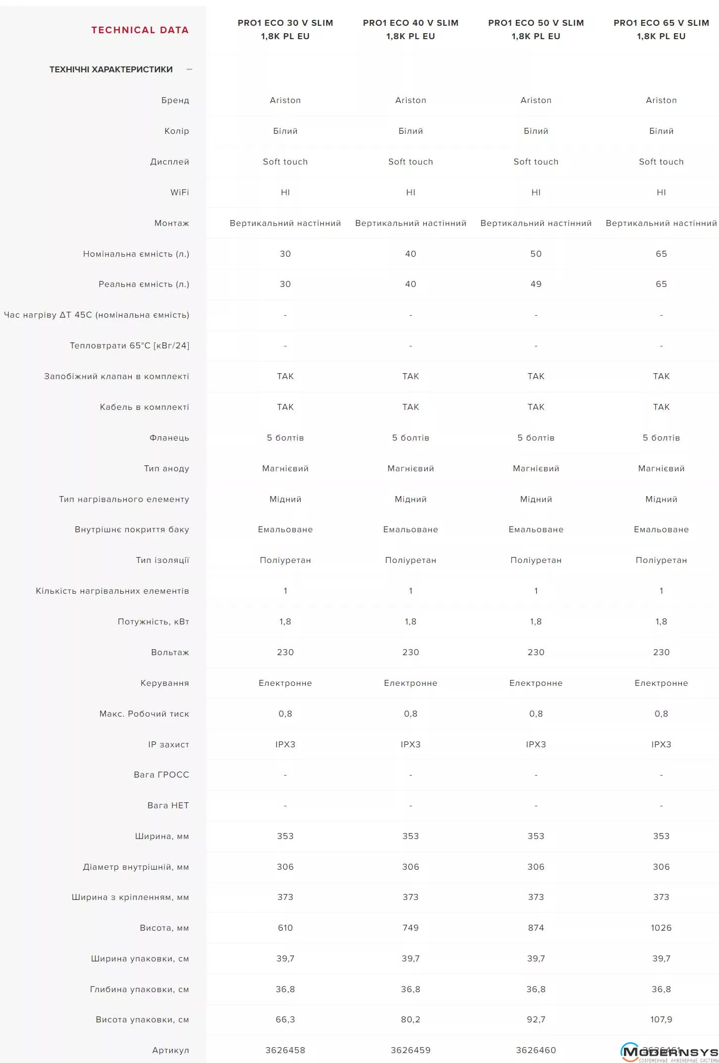 Технические характеристики: Бойлер Ariston (Аристон) PRO1 ECO 40 V SLIM 1,8K PL EU