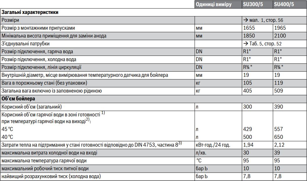 Технические характеристики для бойлеров Buderus Logalux SU300-400