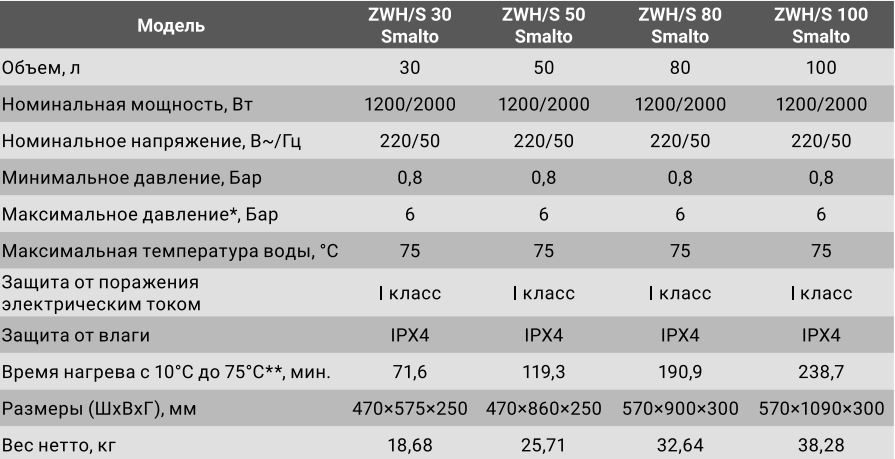 Технические характеристики для серии электрических бойлеров Zanussi Smalto