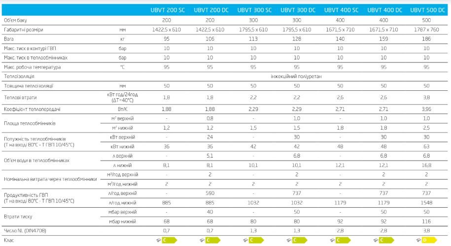 Технические характеристики для бойлера косвенного нагрева Baxi UBVT DC