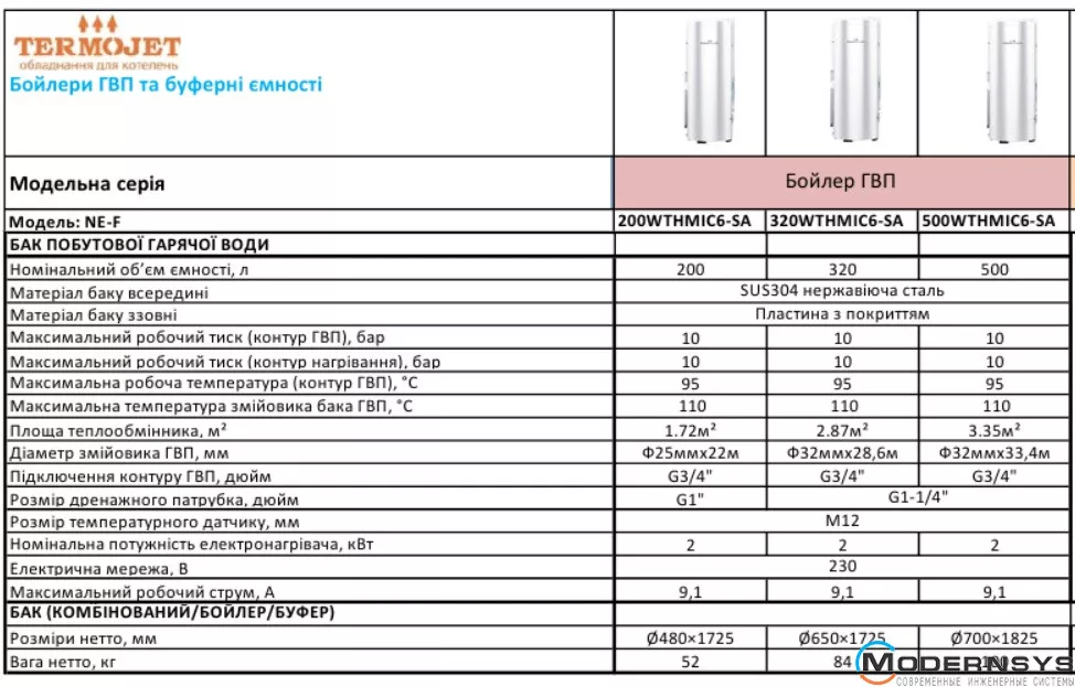 Технические характеристики: Бойлер косвенного нагрева Termojet (Термоджет) 320 литров