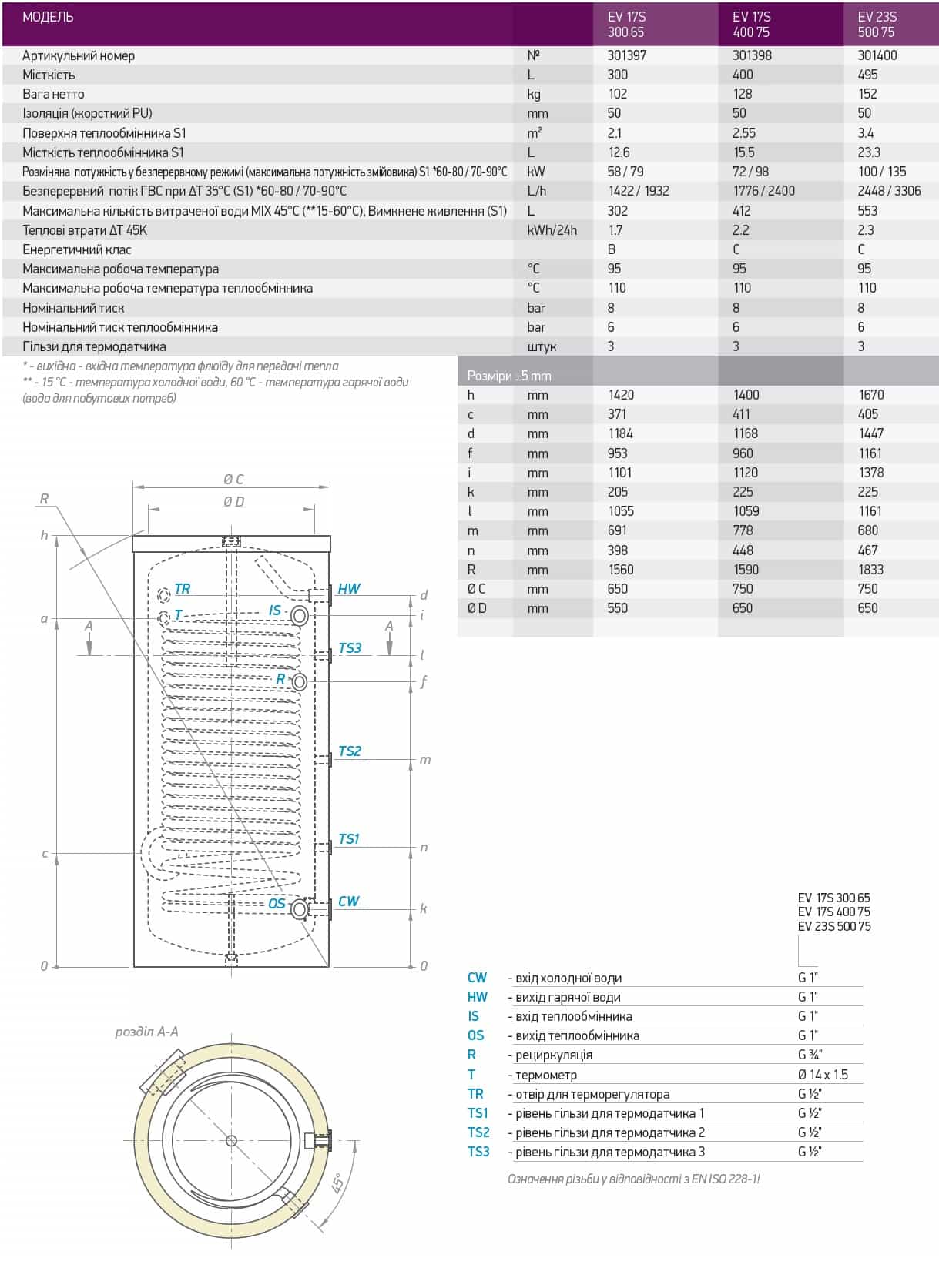 Технические характеристики: Бойлер косвенного нагрева Tesy (Теси) 500 л. - EV 23S 500 75 F42 TP3