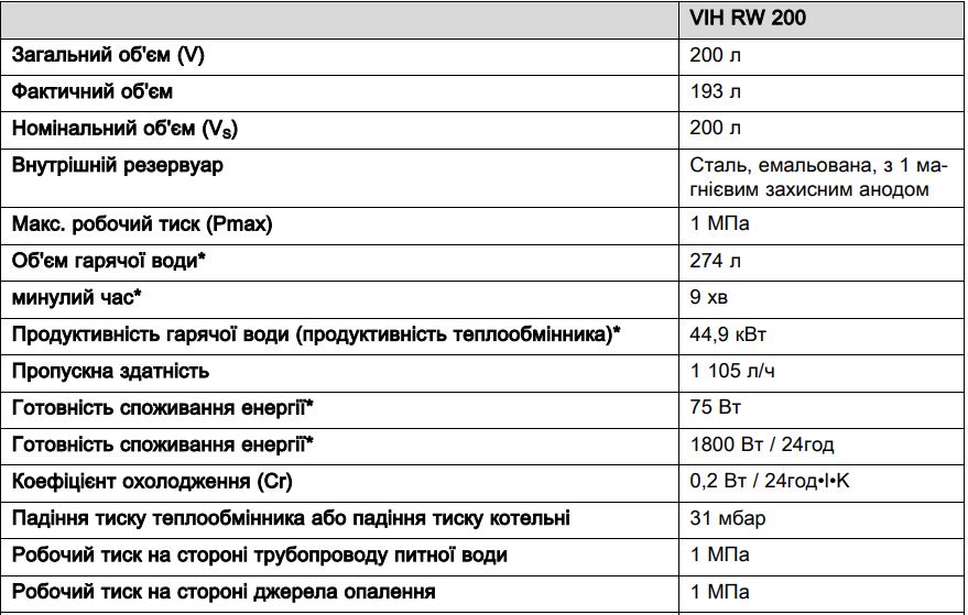 Технические характеристики для бойлера косвенного нагрева Vaillant uniSTOR VIH RW 200 HP
