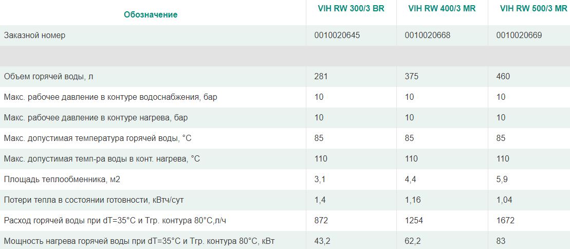 Технические характеристики для серии бойлеров косвенного нагрева Vaillant VIH RW