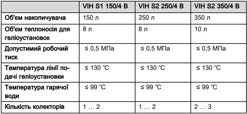 Технические характеристики для серии бойлеров косвенного нагрева Vaillant VIH S 4 B