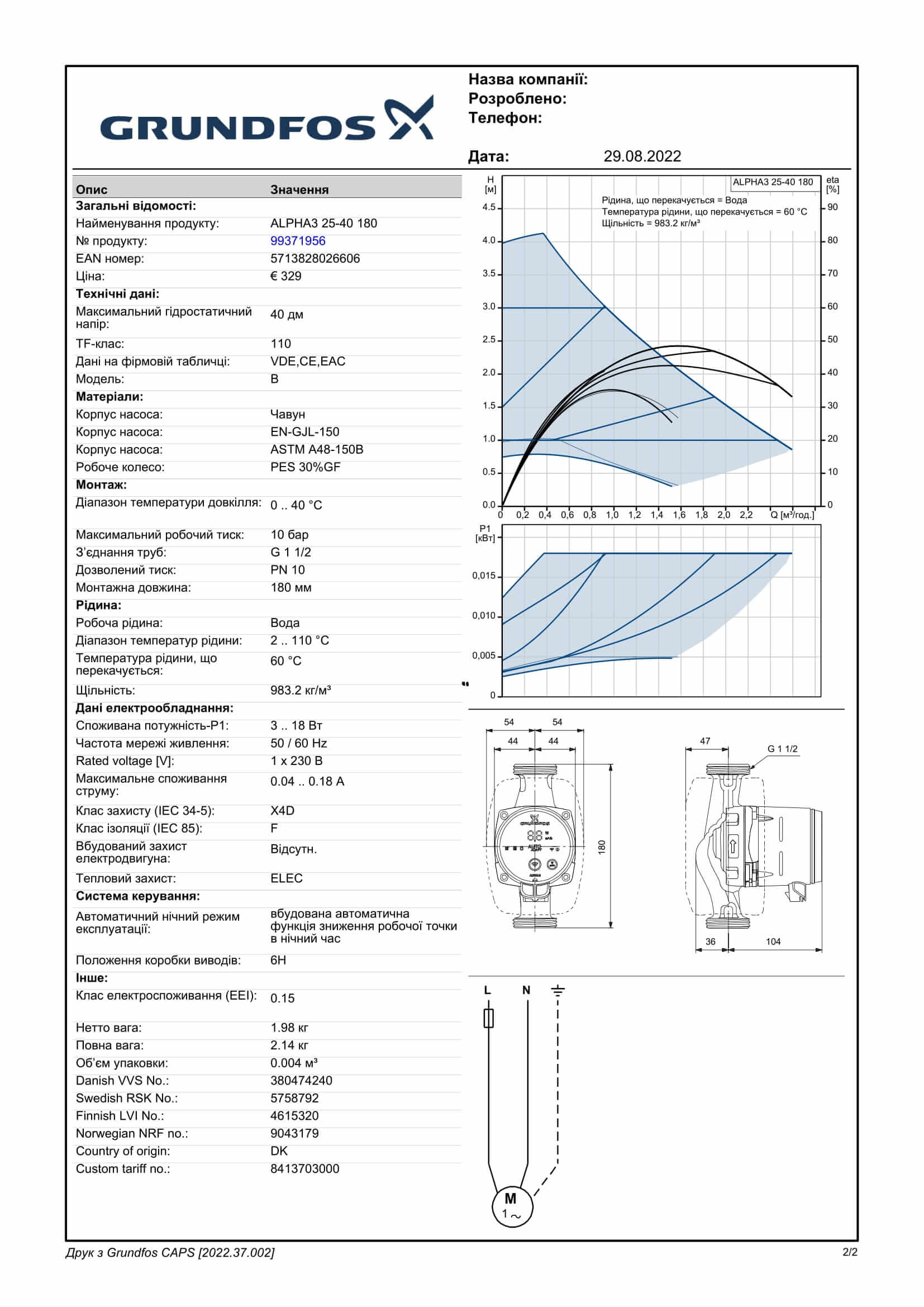 Технические характеристики: Циркуляционный насос Grundfos (Грундфос) ALPHA 3 25/4-180