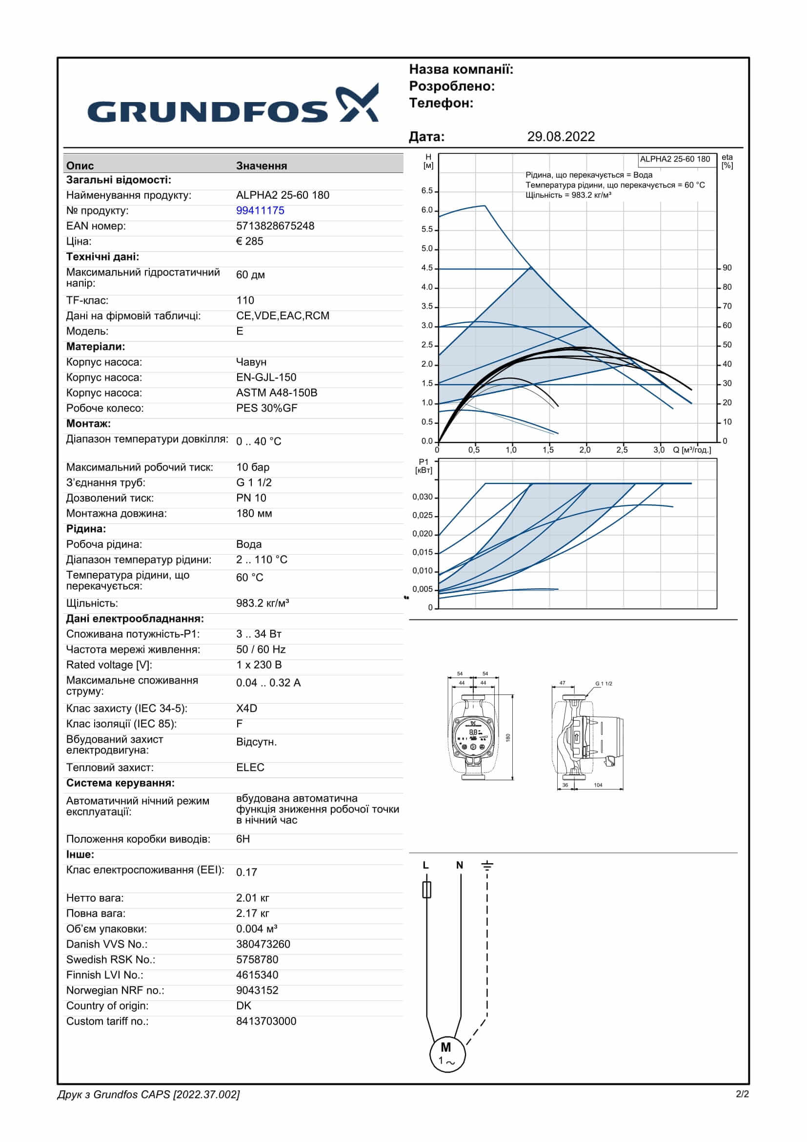 Технические характеристики: Циркуляционный насос Grundfos (Грундфос) ALPHA2 25-60 180 1x230V 50H
