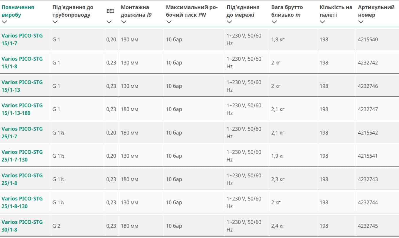 Название товара КОД Модификация Цена Циркуляционный насос Wilo Varios PICO 25/1-7-180 00004662814 408 грн Циркуляционный насос Wilo Varios PICO 25/1-7-130 00004662714 408 грн Циркуляционный насос Wilo Varios PICO 15/1-7-130 00004662614 408 грн Циркуляционный насос Wilo Varios Pico-STG 15/1-13-180 00006028215 532 грн Циркуляционный насос Wilo Varios Pico-STG 25/1-8 00006028014 510 грн Циркуляционный насос Wilo Varios Pico-STG 25/1-8-130 00006027914 510 грн Циркуляционный насос Wilo Varios Pico-STG 30/1-8 00006027814 510 грн Циркуляционный насос Wilo Varios Pico-STG 15/1-8 00006028114 510 грн Циркуляционный насос Wilo Varios Pico-STG 15/1-13 00006028315 532 грн