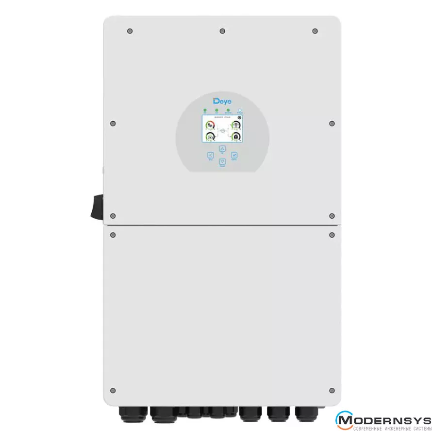Этот гибридный инвертор для альтернативной энергетики оснащен LCD-дисплеем с сенсорным управлением, что упрощает настройку и управление им. При помощи комплектного WiFi модуля можно осуществлять мониторинг работы инвертора и солнечной электростанции через облачный сервис Deye, включая отслеживание генерации солнечных панелей, потребления электроэнергии, состояния аккумулятора и работы генератора.