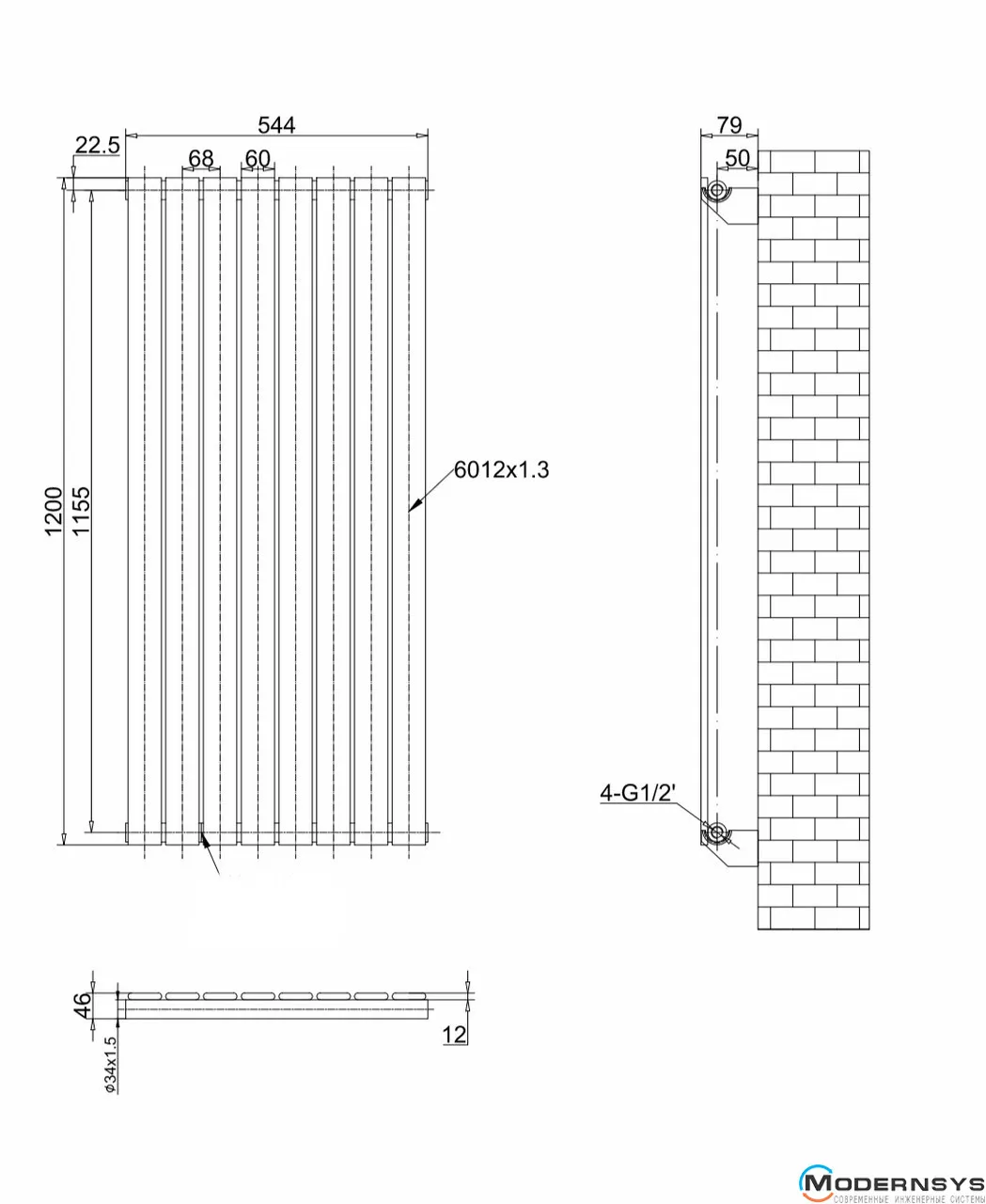 Технические характеристики: Дизайнерский вертикальный радиатор ARTTIDESIGN (Арттидизайн) Livorno 8/1200/544 серый матовый