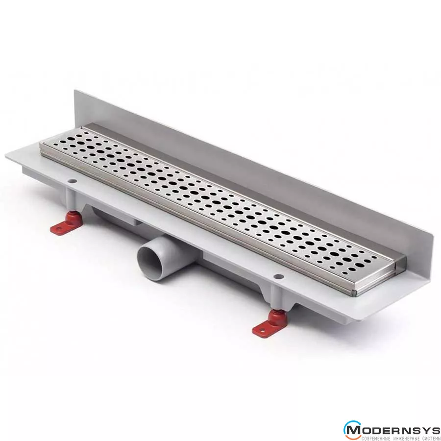 Канал изготовлен из полипропилена, имеет ребра жесткости. Кромка канала имеет нержавеющую рамку для прочности и экоративного эффекта. Вертикальный фланец позволяет быстро и эстетически смонтировать канал у стены, также создает дополнительную и надежную гидроизоляцию угла. Сифон комбинированный – имеет клапаны, которые закрываются, когда вода в сифоне высыхает.