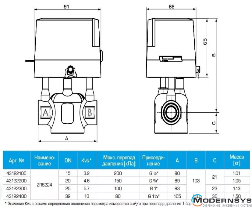 Технические характеристики: Двухходовой моторизированный клапан ESBE (Эсби) ZRS 224 3/4' kvs 4.6 с оборот. пружиной