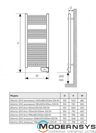 Технические характеристики: Электрическое полотенцесушитель Atlantic (Атлантик) 2012 антрацит 798х400х100мм 300 Вт
