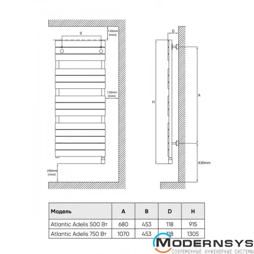 Технические характеристики: Электрическое полотенцесушитель Atlantic (Атлантик) Adelis антрацит 1374х556х118мм 750 Вт