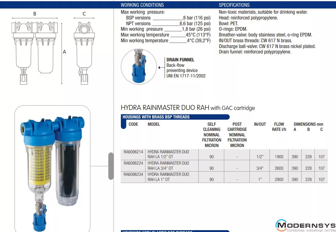 Технические характеристики: Фільтр Atlas Filtri (Атлас Фильтры) HYDRA RAINMASTER DUO Ø1/2" (латунь) + картриджи RAH, LA 45°C 8 bar KIT s.r.l