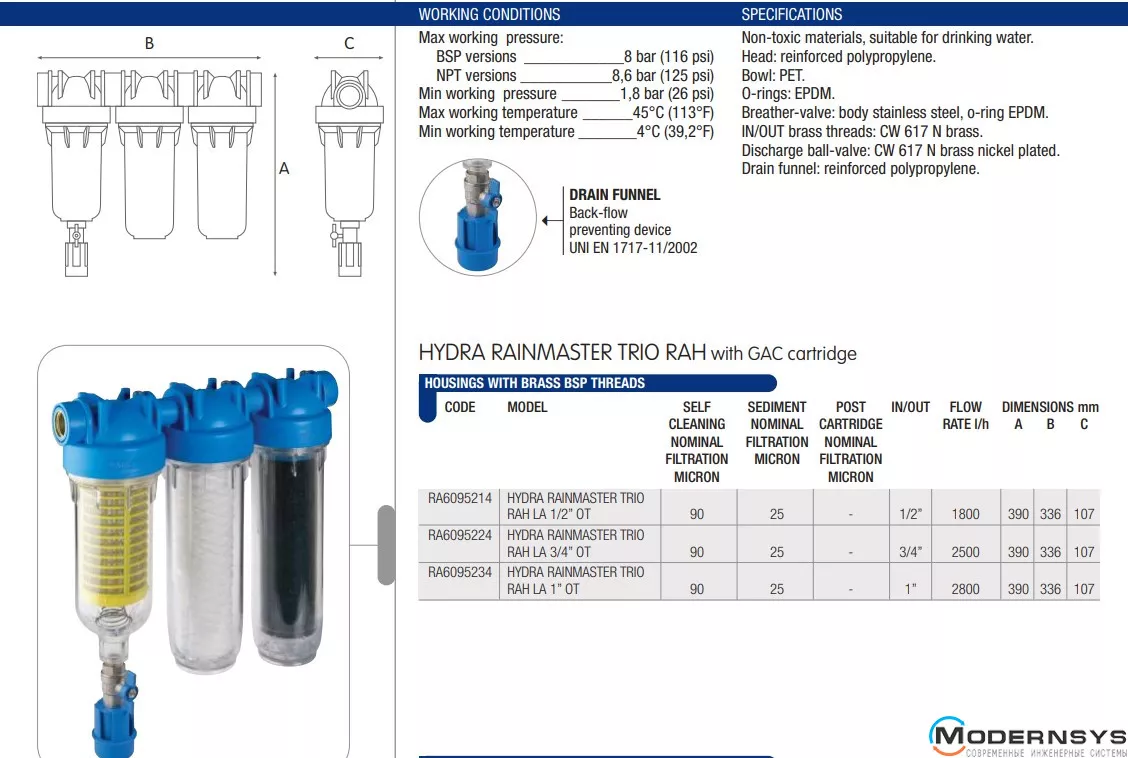 Технические характеристики: Фільтр Atlas Filtri (Атлас Фильтры) HYDRA RAINMASTER TRIO Ø1" (латунь) + картриджи RAH, FA, LA 45°C 8 bar KIT