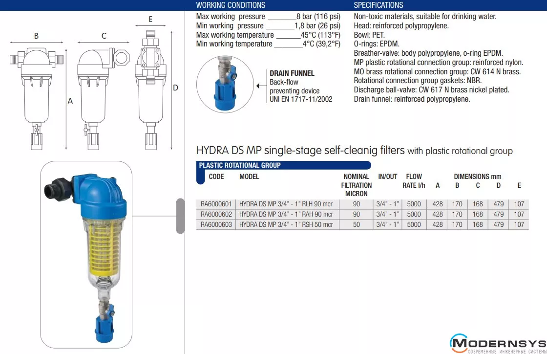 Технические характеристики: Фільтр Atlas Filtri самопромивний Atlas Filtri (Атлас Фильтры) HYDRA DS MP (поворотна група) Ø3/4÷1" + картридж RLH