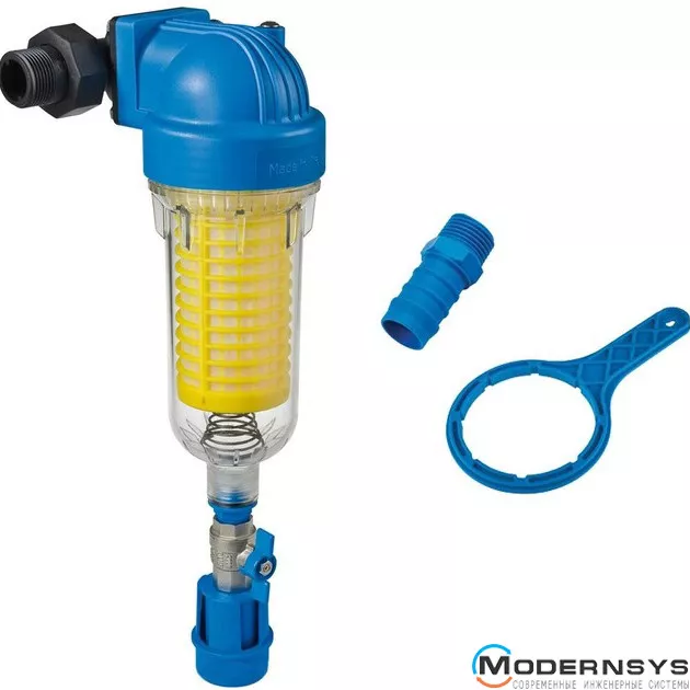 Одноступенчатый промывной фильтр Atlas Hydra DS с подключением 3/4-1" дюйм имеет функцию промывания в противотоке, что обеспечивает лучшее удаление частиц, которые накопились на поверхности патрона (активируется при открытии сливного клапана на дне фильтра).