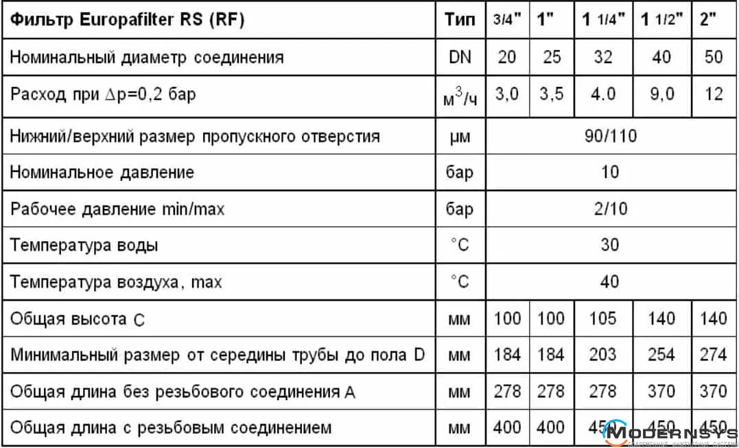 Технические характеристики: Фильтр для холодной воды BWT (БВТ) EUROPAFILTER RS (RF) 1"