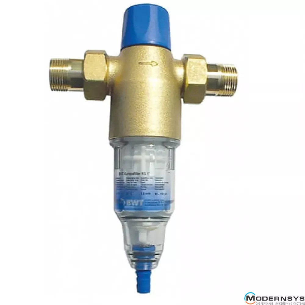 Предотвратить попадание в воду мелких механических загрязнений и защитить свое оборудование можно, установив на входе сетчатый самопромывной фильтр. К примеру, механический фильтр BWT EUROPAFILTER RS (RF) 1˝ отлично справляется с поставленными задачами. В линейке производителя BWT представлены модели с диаметрами подключения: ¾˝, 1˝, 1¼˝, 1½˝, 2˝. При необходимости можно дополнительно установить редуктор понижающий давление и манометр.