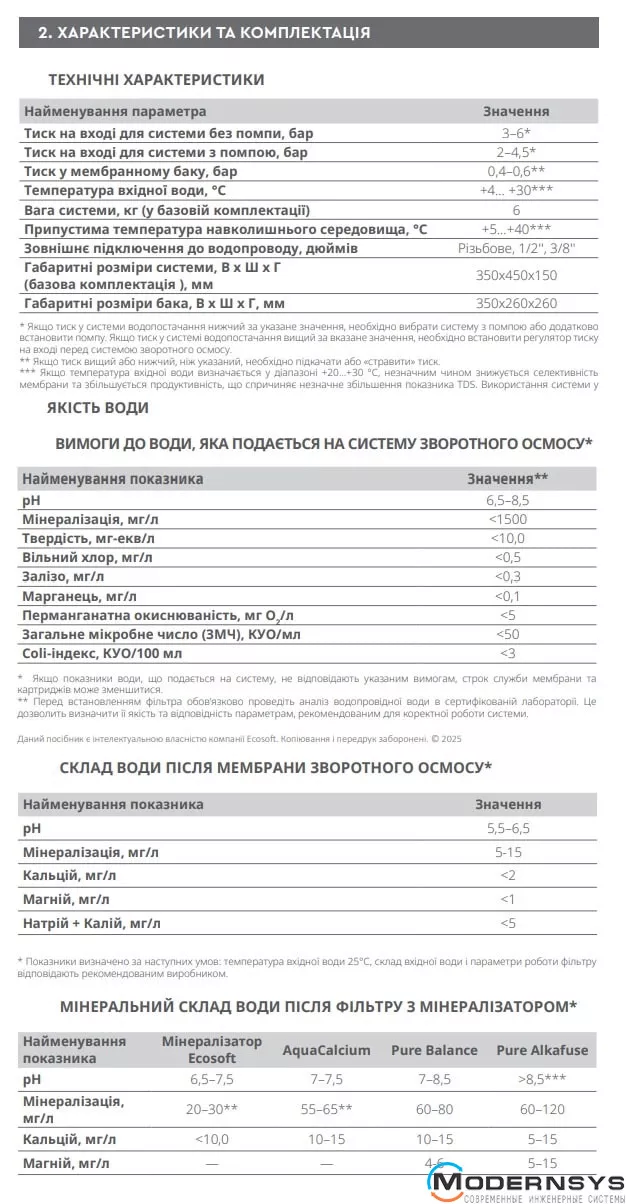 Технические характеристики: Фильтр обратного осмоса Ecosoft (Экософт) P'URE AquaCalcium MINT