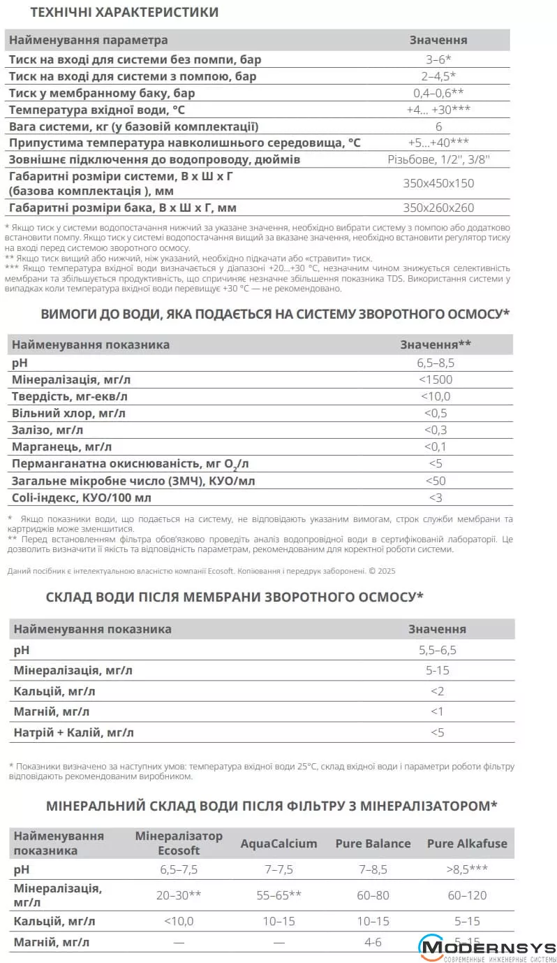 Технические характеристики: Фильтр обратного осмоса Ecosoft (Экософт) P'URE AquaCalcium MINT с помпой на станине