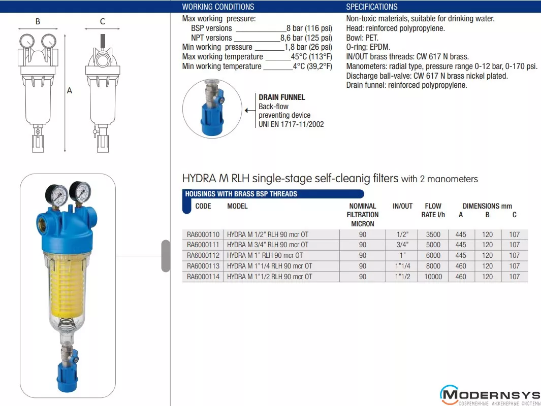 Самоочищающийся фильтр для воды Hydra подходит для трех специальных картриджей SX (DOE). RAH (сетка из нержавеющей стали), RLH (полиэфирная сетка) и RSH (металлизированная полипропиленовая сетка), каждый предназначен для определенных функций и уровней фильтрации. Доступны патрубки вх/вых 1/2", 3/4", 1", 1 1/4", 1 1/2" с латунной или пластиковой резьбой BSP, или с пластиковой резьбой NPT 3/4", 1" и 1/2". Пропускная способность от 3000 до 10000 л/ч. Также доступна модель M с двумя манометрами и большим выбором аксессуаров и запчастей. Самоочищающиеся фильтры сертифицированы международными органами, которые подтверждают, что их качество и производительность соответствуют действующим стандартам.