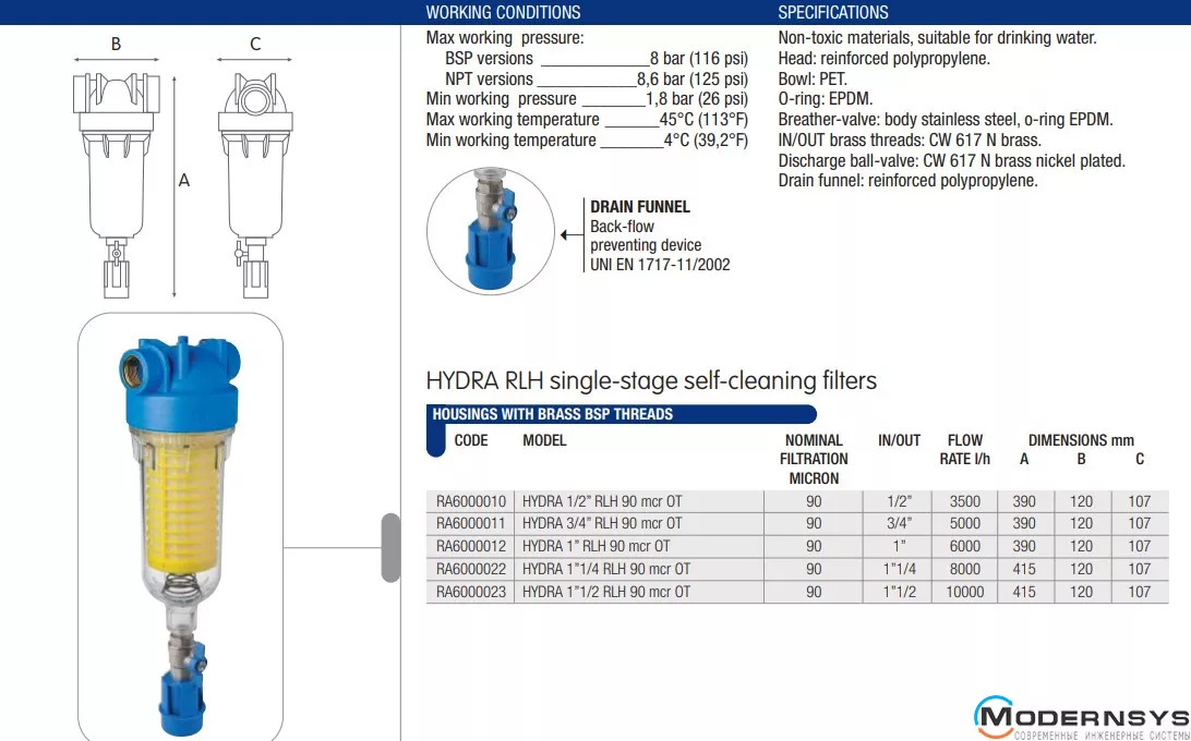 Модели RLH с сетчатым картриджем из пластика 90 микрон. Патрубки ВХ./ВЫХ. размером 1/2”, 3/4”, 1”, 1-1/4”, 1- 1/2” с цилиндрической резьбой (BSP) из латуни или пластика; модели с конической резьбой (NPT) из пластика размером 3/4”и 1”. Пропускная способность 3000-10000 л/ч. M-модели с двумя манометрами. MP-модели с пластиковыми патрубками ВХ./ВЫХ. с наружной цилиндрической резьбой (BSP). Самоочищающиеся фильтры HYDRA HOT для фильтрации горячей воды со специальным картриджем RAH HOT. Самоочищающиеся фильтры HYDRA K с латунной головкой. Все модели оборудованы сливной воронкой для защиты питьевой воды от рефлюкса, в соответствии со стандартом UNI EN 1717-11/2002.