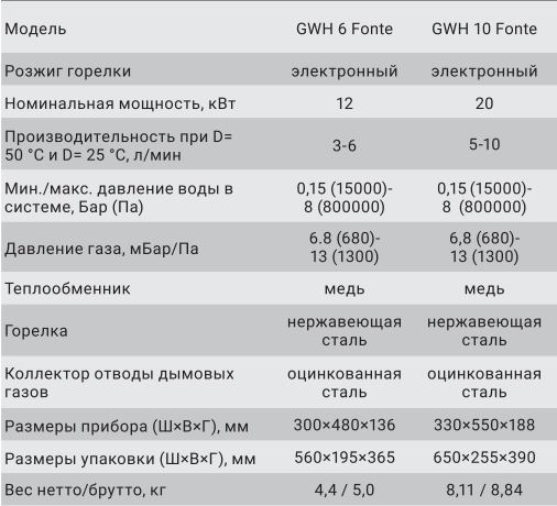 Технические характеристики для газовых колонок Zanussi GWH Fonte