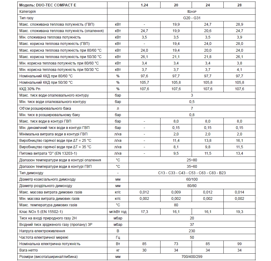 Технические характеристики: Газовый котёл Baxi (Бакси) DUO-TEC COMPACT E 20