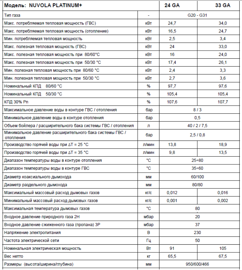 Технические характеристики: Газовый котёл Baxi (Бакси) NUVOLA PLATINUM 33+ GA