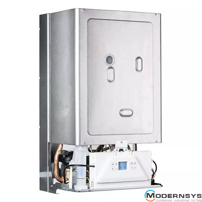 - Конденсационный теплообменник из нержавеющей стали с очень широкими проходами для воды.
