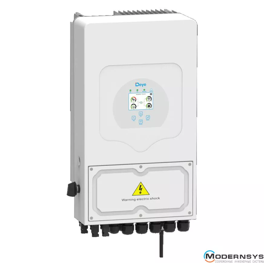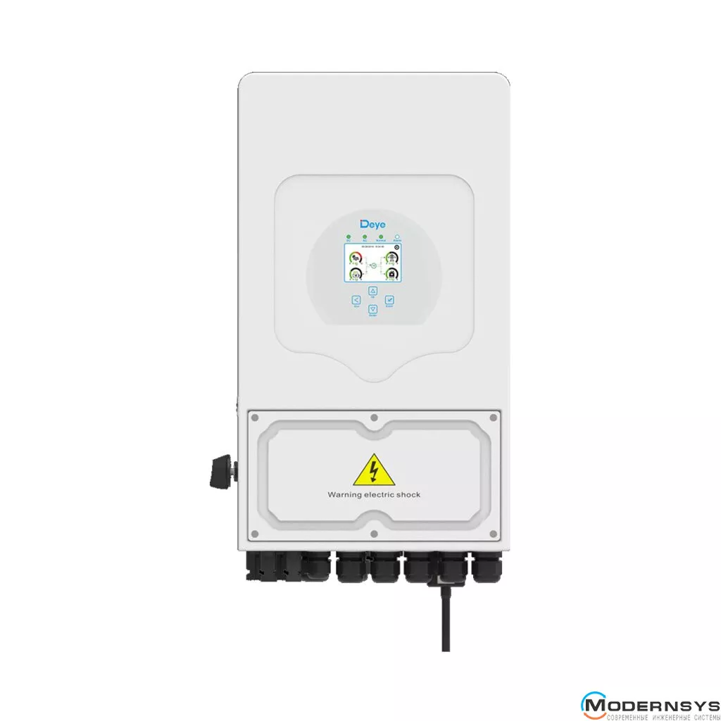Этот гибридный инвертор для альтернативной энергетики оснащен LCD-дисплеем с сенсорным управлением, что упрощает настройку и управление им. При помощи встроенного WiFi модуля можно осуществлять мониторинг работы инвертора и солнечной электростанции через облачный сервис Deye, включая отслеживание генерации солнечных панелей, потребления электроэнергии, состояния аккумулятора и работы генератора.