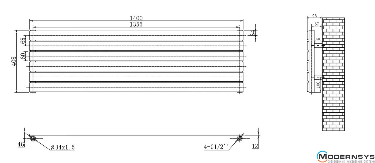 Технические характеристики: Горизонтальный дизайн радиатор ARTTIDESIGN (Арттидизайн) Livorno G 6/408/1400 белый матовый