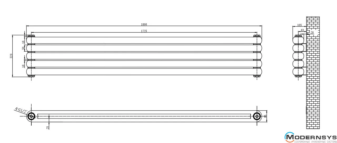 Технические характеристики: Горизонтальный дизайн радиатор ARTTIDESIGN (Арттидизайн) Sora 5/320/1800 белый матовый