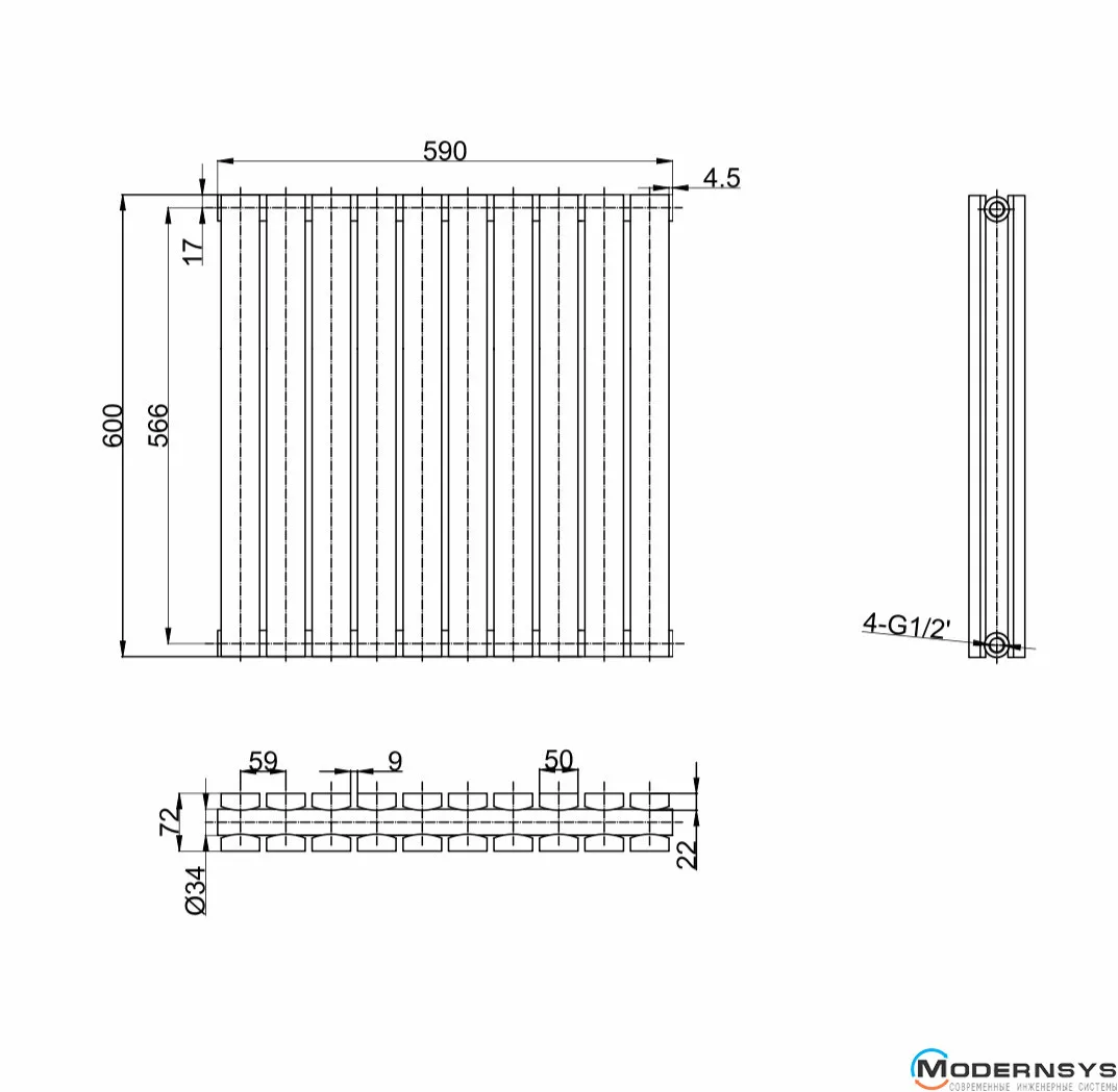 Технические характеристики: Горизонтальный дизайн радиатор ARTTIDESIGN (Арттидизайн) Terni II G 10/600/590 серый матовый