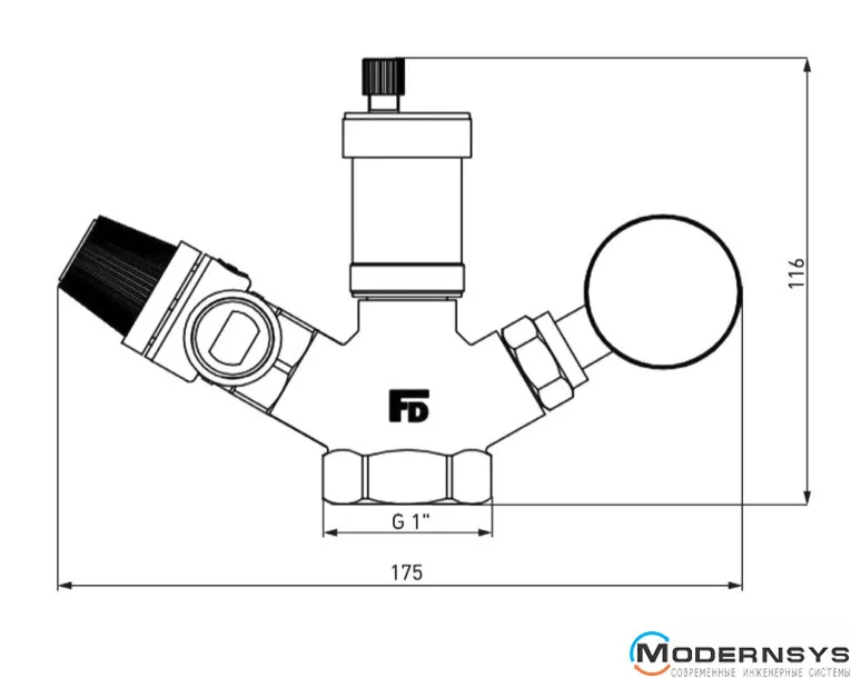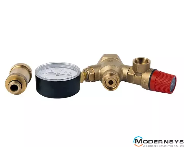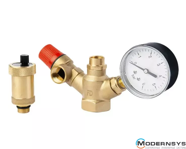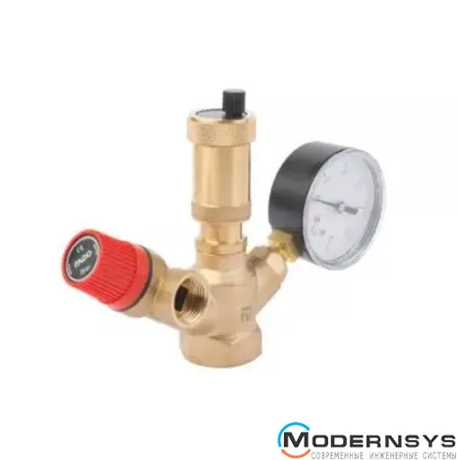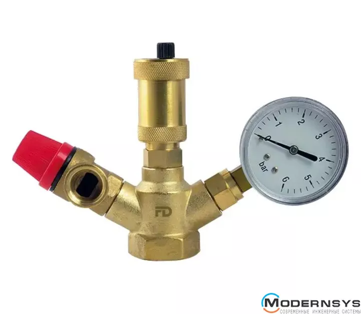 Группа безопасности FADO - полнопроходная с повышенным ресурсом. Корпус латунный, никелированный. Состав изделия: предохранительный клапан (настройка - фиксированная, 3 бара), автоматический воздухоотводчик, манометр. Номинальное давление не выше 10 бар, рабочей температурой не более 120 °С. Резьба присоединения - внутренняя.