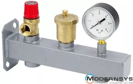Группа безопасности комплектуется автоматическим поплавковым воздухоотводчиком, предохранительным клапаном и манометром. Изделие имеет фланец для консольного крепления к стене.